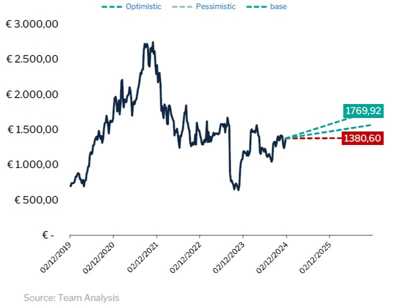 EPS (Earnings Per Share): EPS grew from €6.0 in 2019 to €11.8 in 2023, with a Compound Annual Growth Rate (CAGR) of 14.52%. Projections indicate EPS will reach €19.6 by 2028, growing at a 10.14% CAGR.
