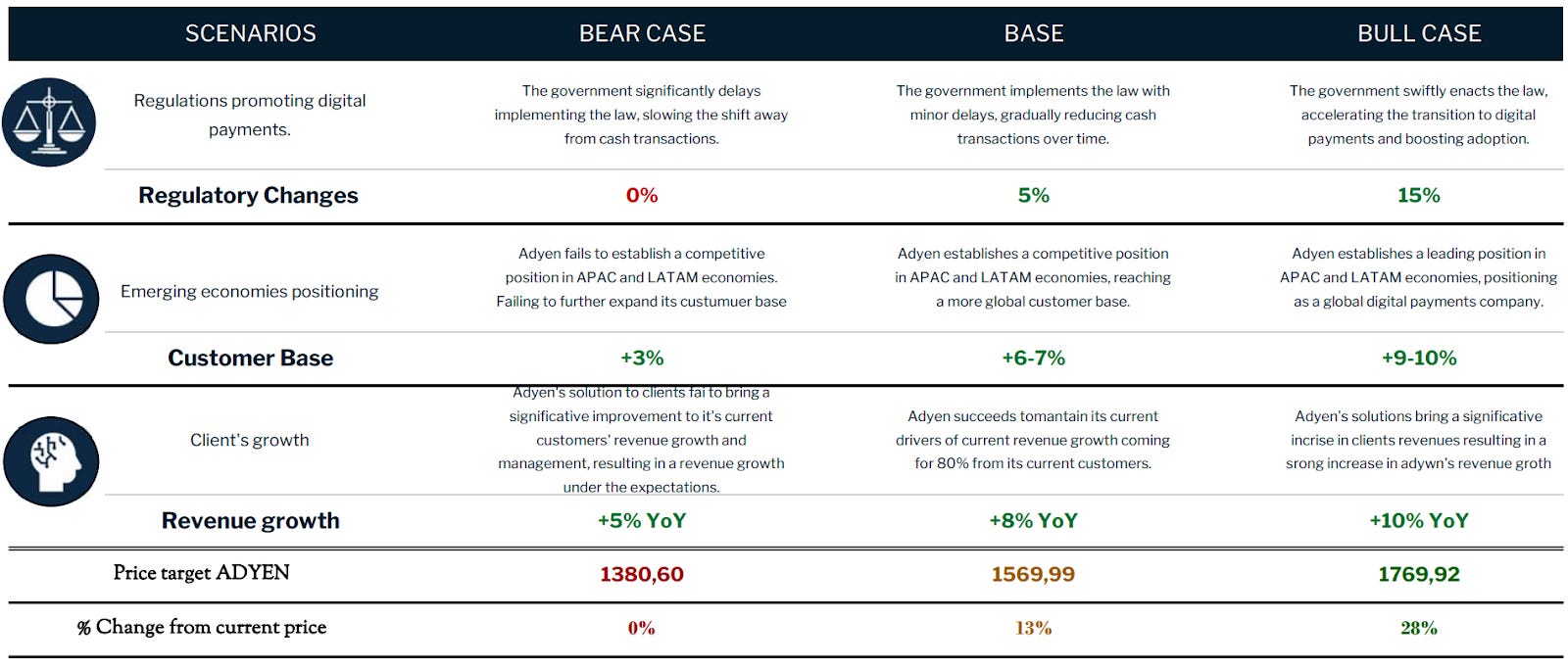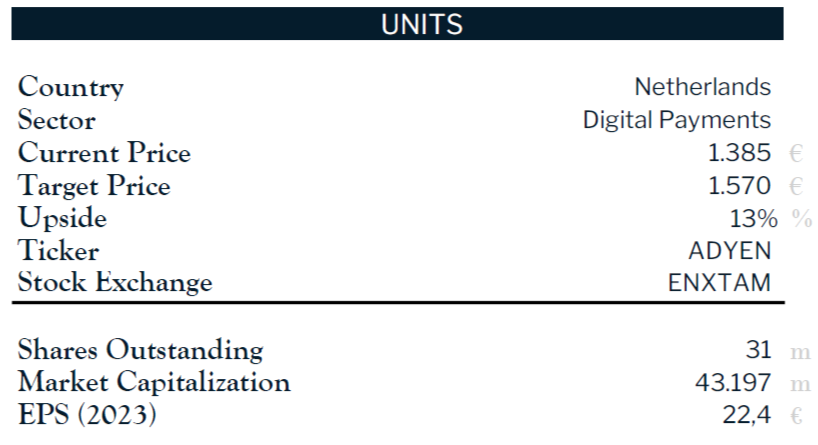 Final recommendation: We issue a BUY recommendation for Adyen with a one-year target price of €1556, presenting a 22% upside potential from ADYEN's closing price of €1277 on November 17th, 2024.