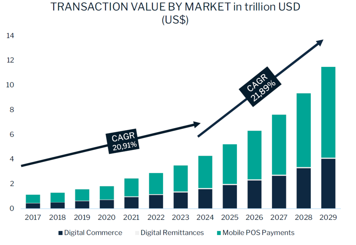 Digital Payments Market Growth: the digital payments market is projected to grow from €5.83 trillion in 2023 to €12.93 trillion by 2029, driven by e-commerce expansion, mobile payment adoption, and advances in AI-driven fraud prevention.