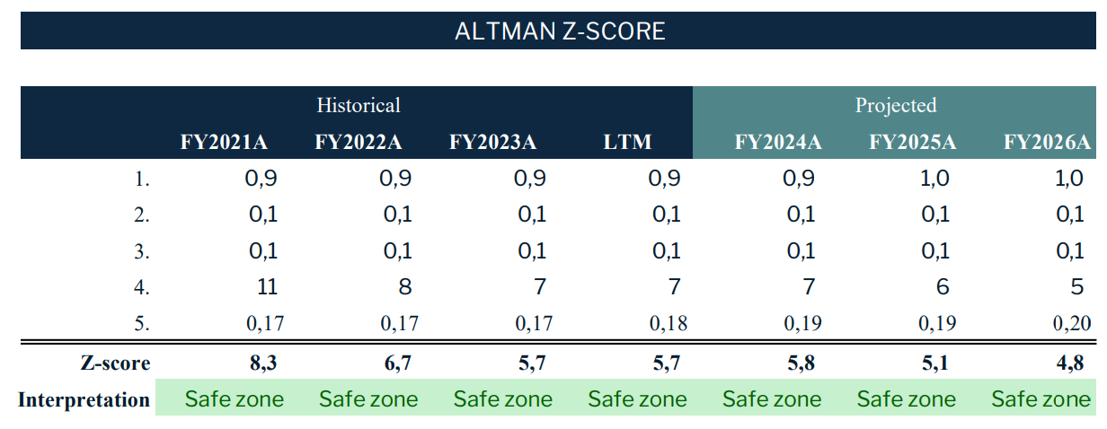 Based on our analysis, the company is in a safe zone, with a low risk of default in the short to medium term.