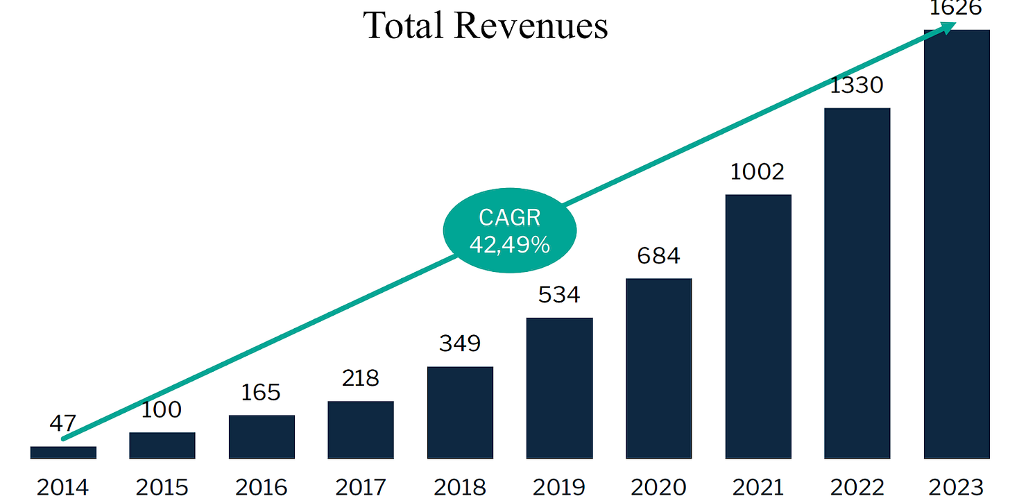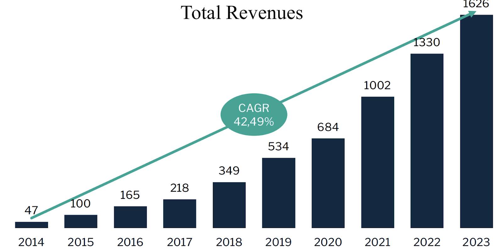 Adyen demonstrated robust revenue growth from 2014 to 2023, achieving a CAGR of approximately 25%. In 2023, net revenue reached €1.63 billion, a 22% increase from €1.33 billion in 2022.