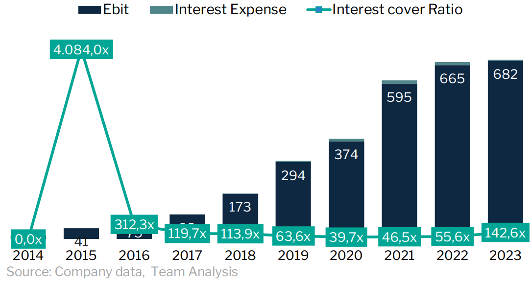 ROE (Return on Equity): ROE grew from 9% in 2015 to a stable 25% in 2023, with peaks at 31% in 2019 and 2021, driven by exceptional profitability and balanced equity growth.